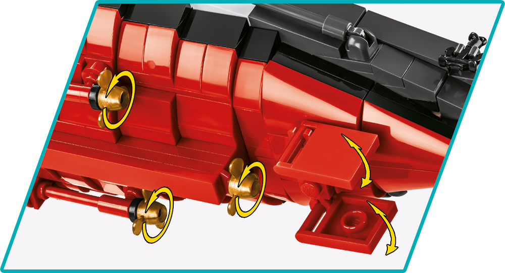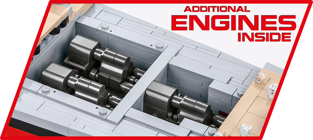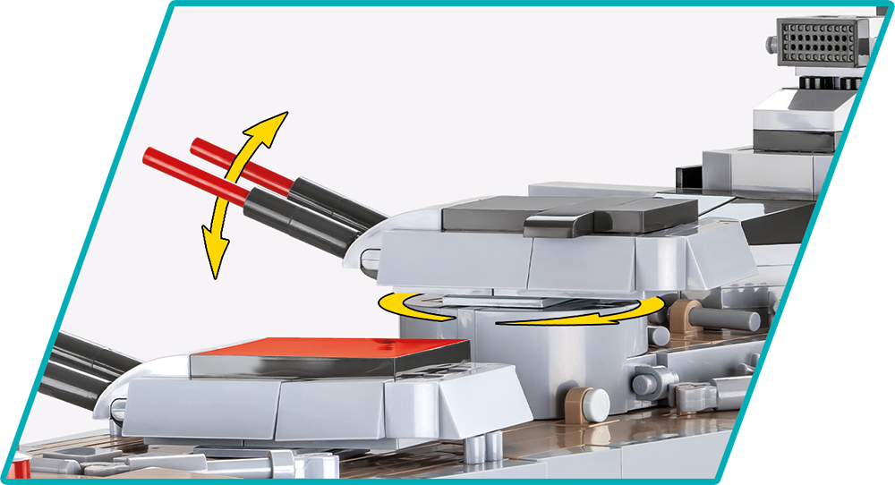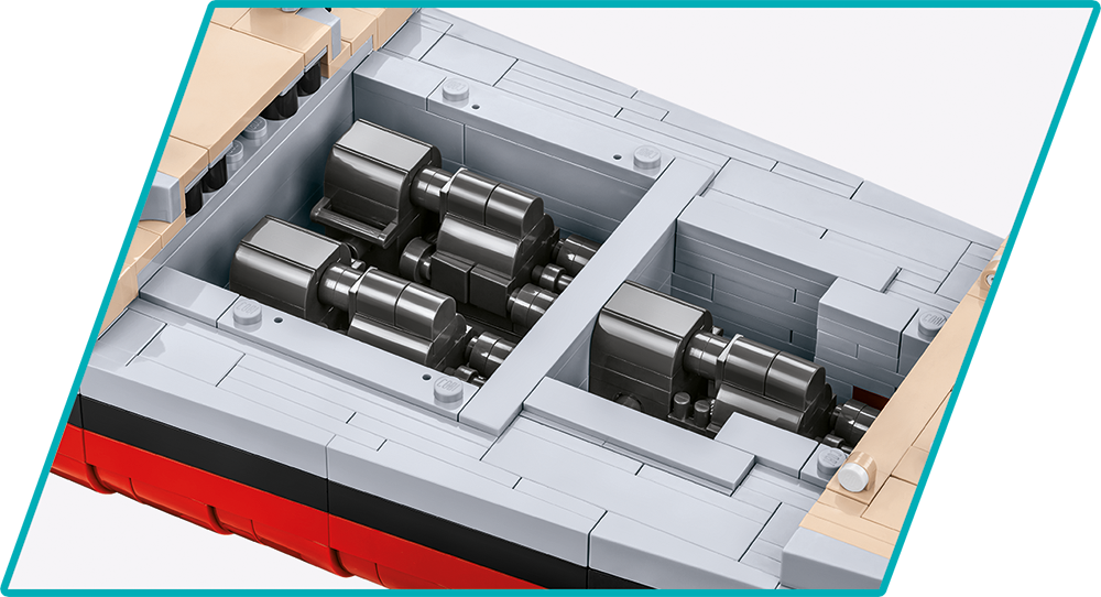 The all-new Bismarck model created by COBI was produced in a scale of 1:300. It consists of 2933 elements and is 86.5 cm long. The latest edition of Bismarck is a ship designed completely from scratch. It contains over 900 more bricks compared to older editions. It faithfully reflects the proportions of the historical ship and preserves all its essential elements, including the original camouflage. The design depicts the so-called "Baltic paint scheme", i.e., camouflage containing black and white stripes and red tops of artillery towers. Such colors were used during training in the Baltic Sea. Numerous blocks feature high-quality, abrasion-resistant prints! The model has numerous movable parts such as propellers, rudders, rotating turrets and gun barrels that can be raised and lowered. The model is huge, has great display value and we especially recommend it to enthusiasts of naval history and building block collectors. It does not require gluing or painting because its entire body and all elements consist of COBI construction blocks.