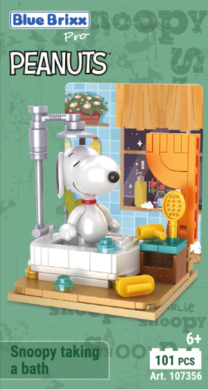 Rubber ducky not included! BlueBrixx presents set 107356, a delightful 101-piece diorama capturing everyone's favorite beagle enjoying a relaxing soak in the tub. This charming mini-scene brings a touch of Peanuts whimsy to any display space.
