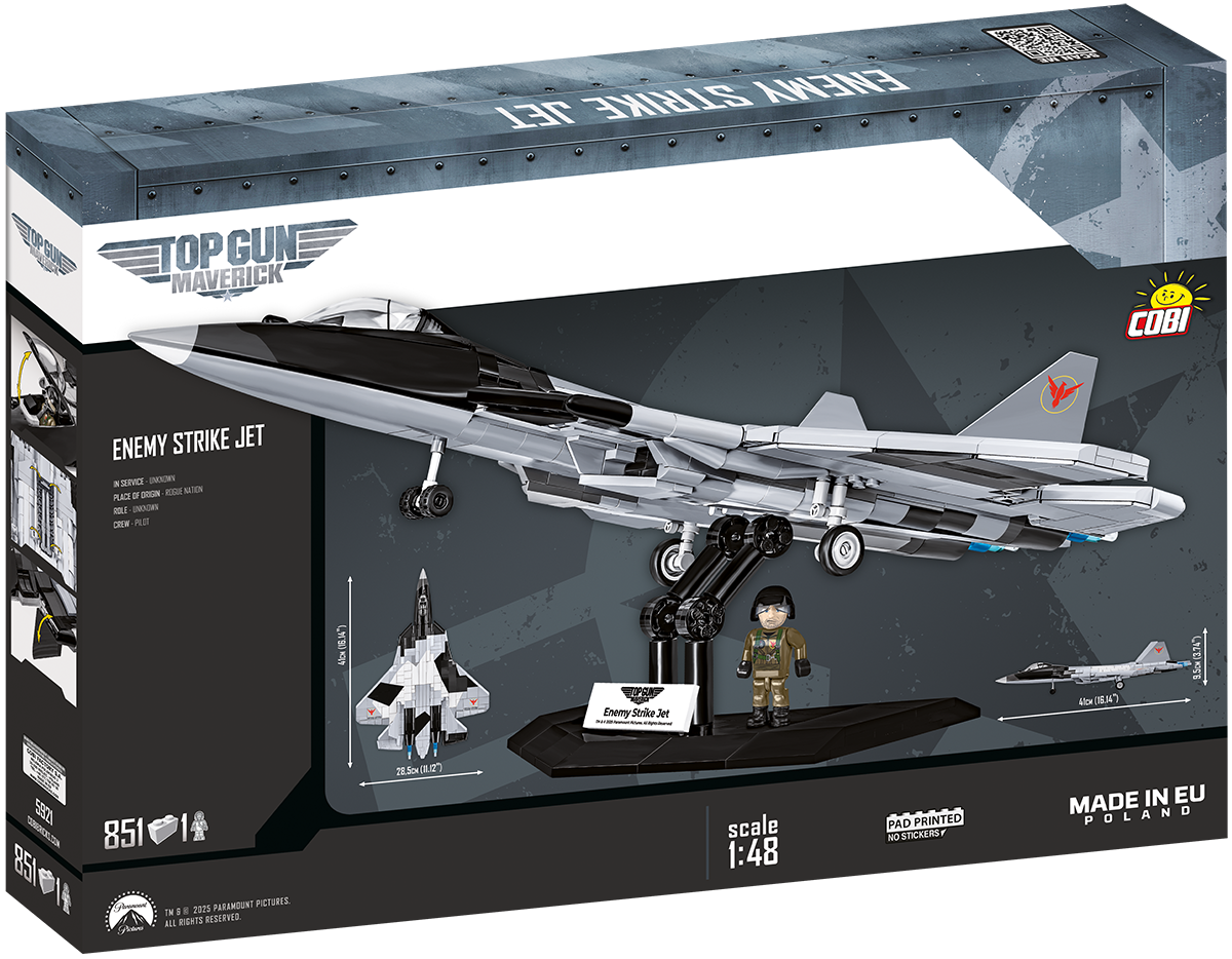 COBI's 1:48 scale fighter jet model is a faithful replica of the fictional fighter jet from Top Gun: Maverick, which represented the mysterious forces of an unknown Middle Eastern nation in the story. The paint scheme and markings have been meticulously recreated from the film original – exactly as they appear on screen! The same digital camouflage, the same colors and the same atmosphere of mystery and terror that accompanied Maverick and his students on their climactic mission.