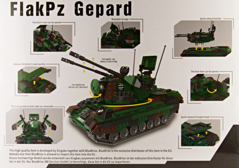 - Design: This model accurately represents the FlakPz Gepard, a German self-propelled anti-aircraft gun based on the Leopard 1 tank chassis. The set includes intricate details such as a rotatable turret, adjustable radar, and realistic exterior components.