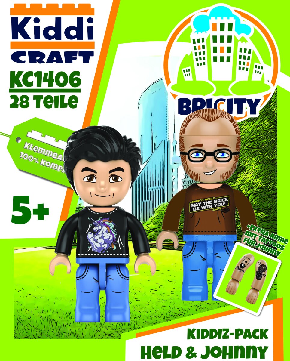 Pay homage to renowned brick enthusiasts with the Kiddicraft KC1406 Brick City – KIDDIZ Pack: Held der Steine & Johnny's World. This exclusive set features two meticulously designed KIDDIZ figures, allowing fans aged 5 and above to incorporate these iconic personalities into their building adventures.