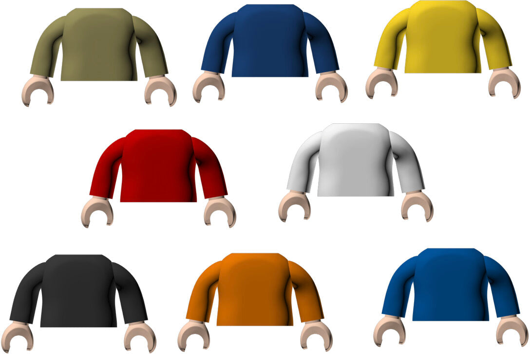 - Eight Torsos: Unprinted upper bodies in various colors—red, black, white, blue, orange, dark blue, khaki green, and yellow—allowing for personalized customization.