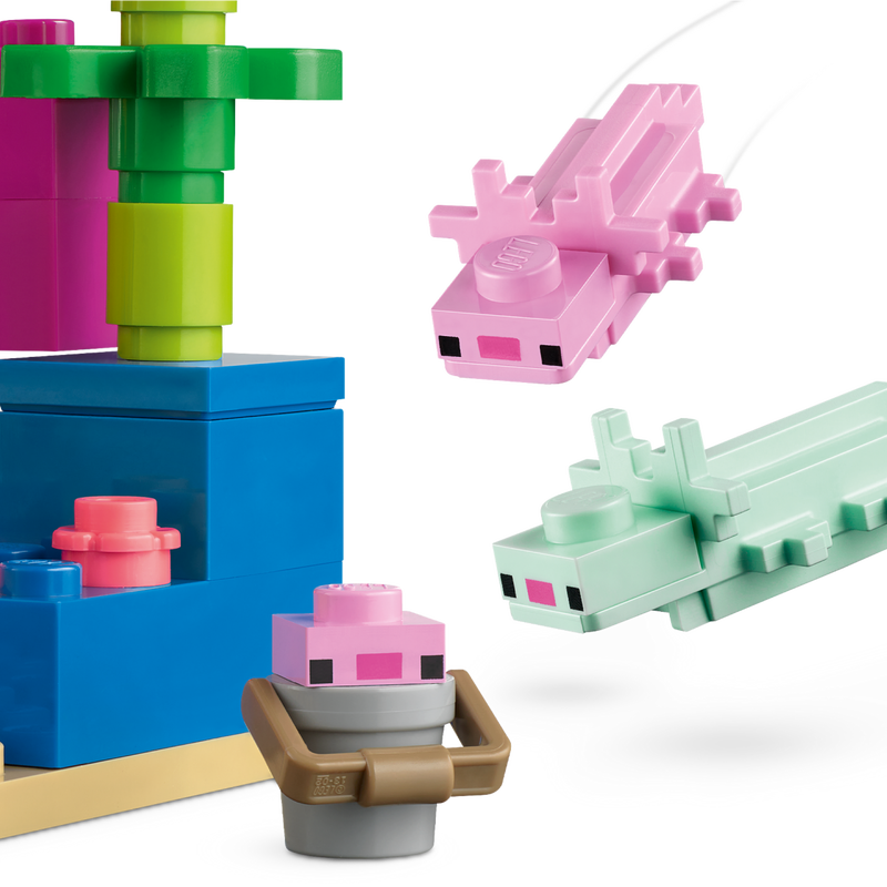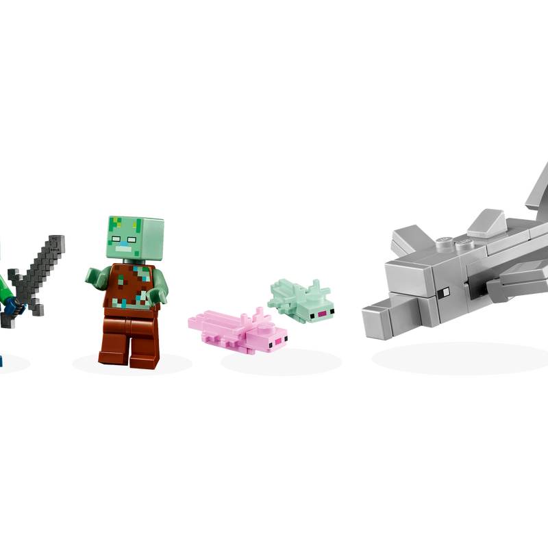 - Familiar characters – Includes authentic Minecraft® figures: an underwater explorer, a drowned zombie, dolphin, puffer fish, 2 adult axolotls and an axolotl in a bucket