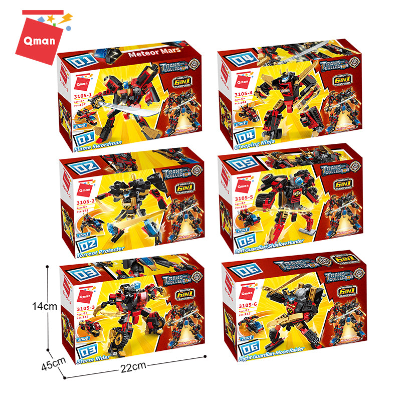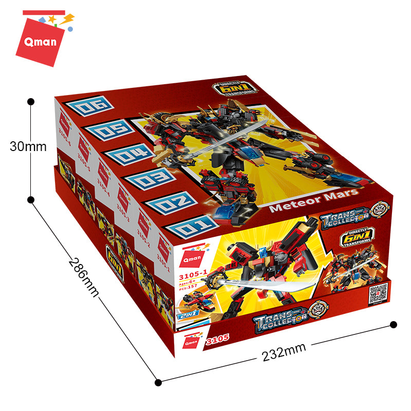 Experience the excitement of interstellar battles with the Qman Meteor Mars 6-in-1 Building Set, Model 3105. This versatile set allows you to construct six unique robot warriors that combine into the powerful "Meteor Mars" super mech.
