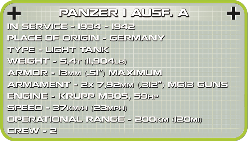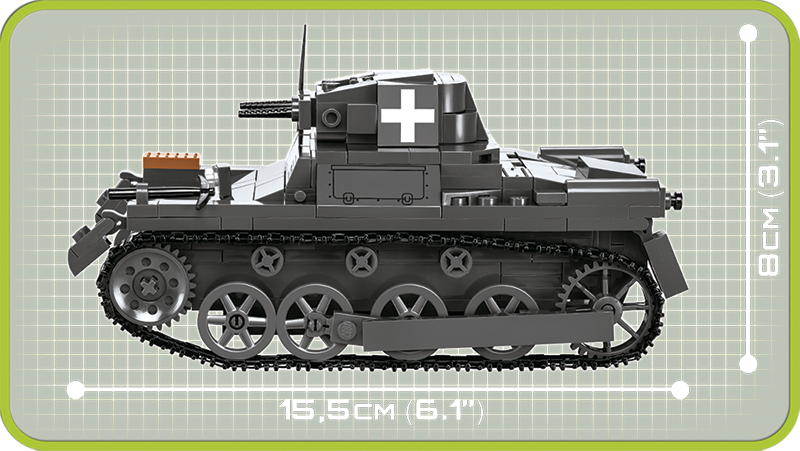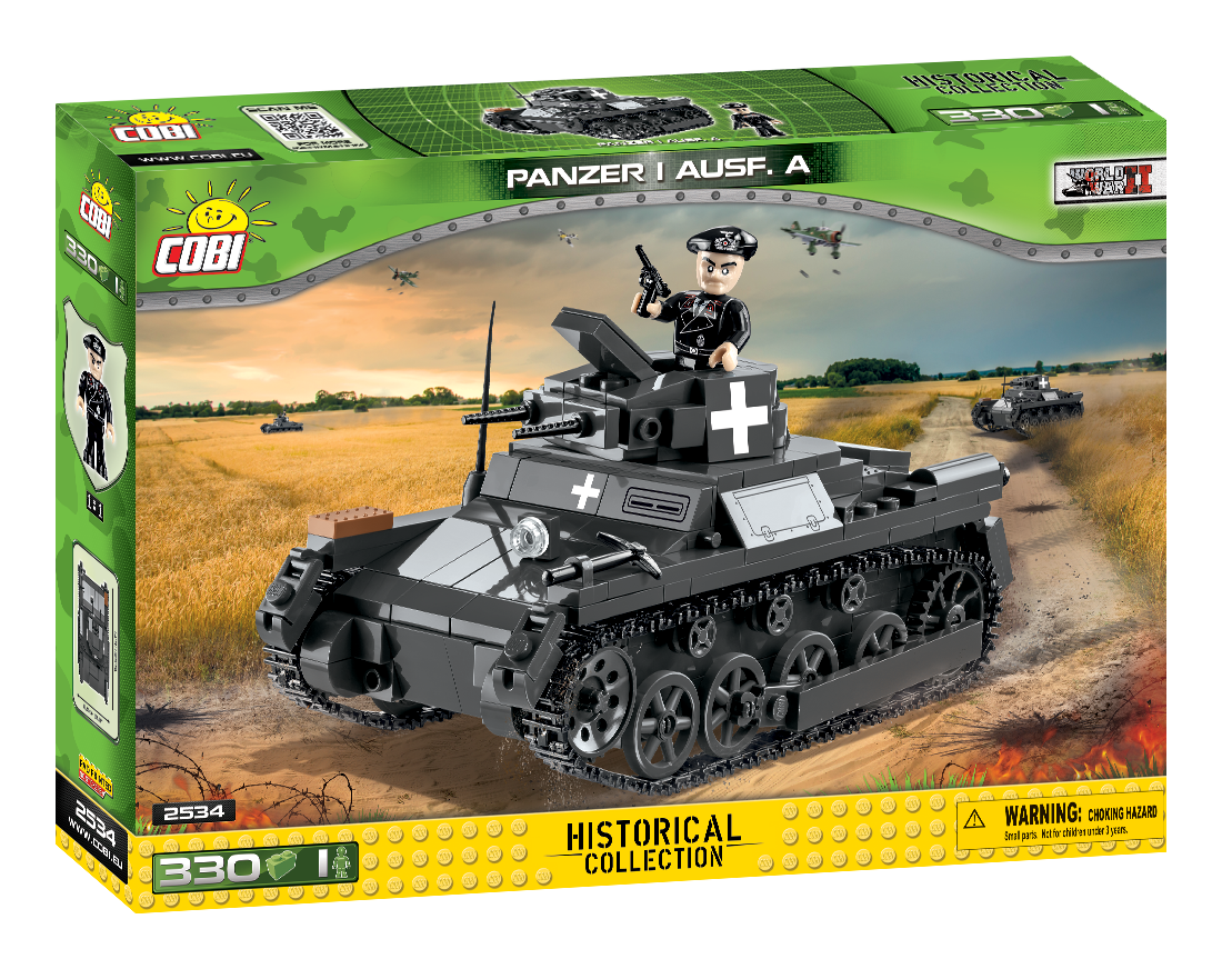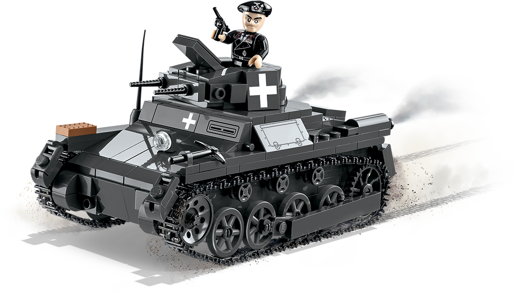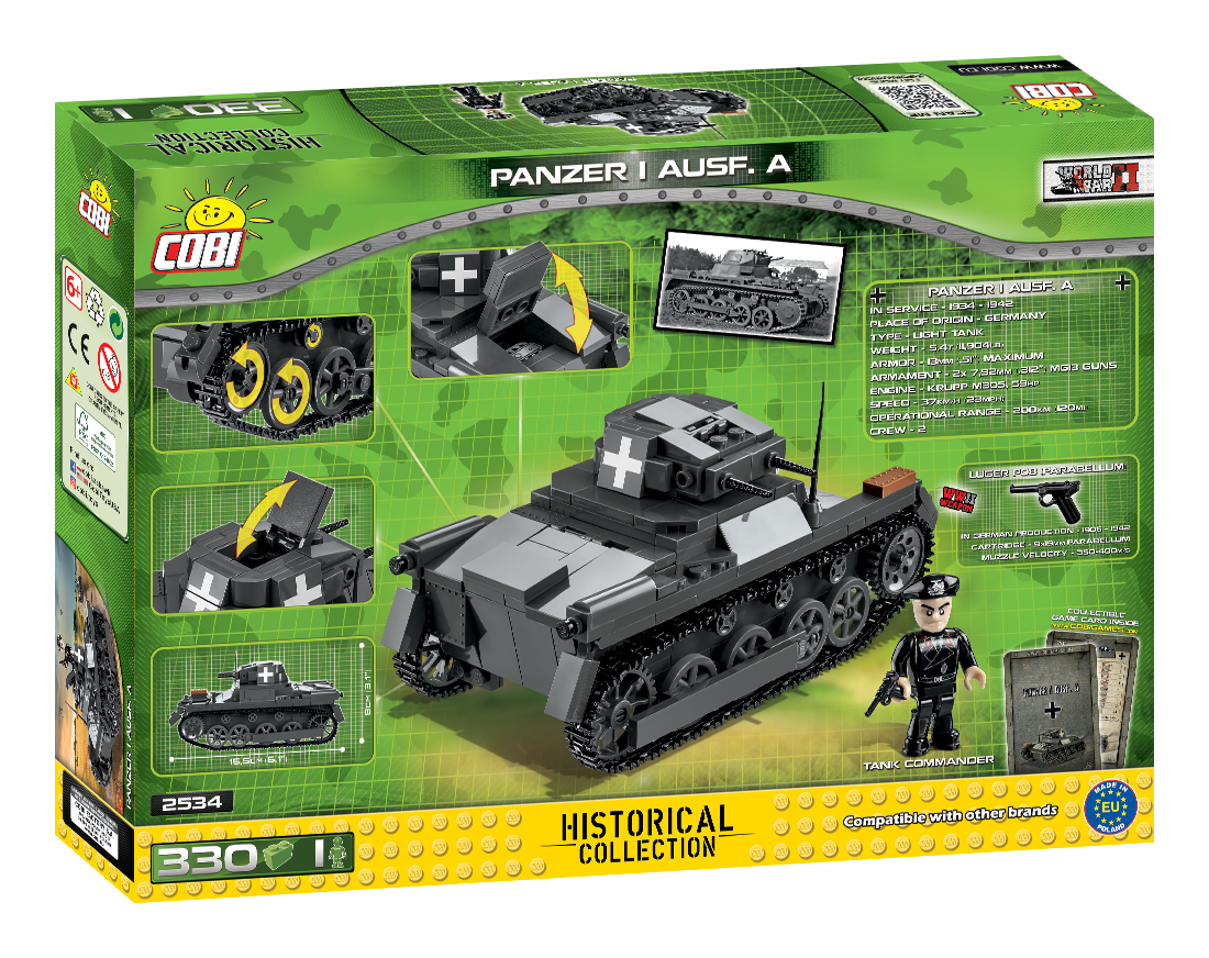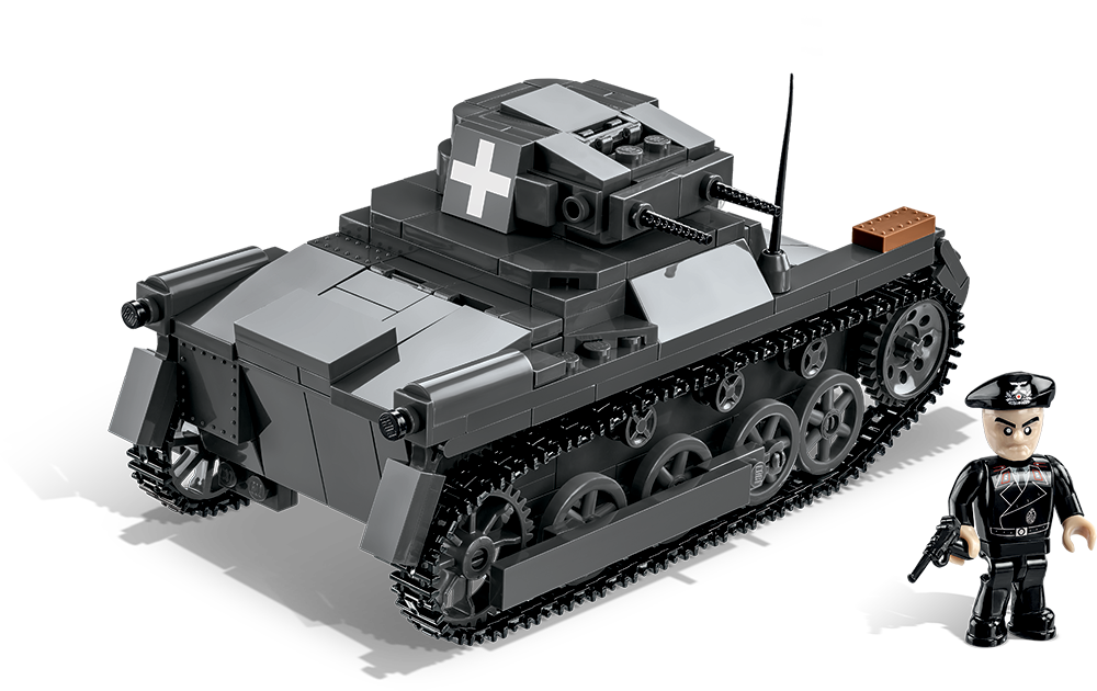 Panzer I Ausf. A is a German light tank, used at the beginning of World War II.From 1934 to 1939, a total of about 2000 units were produced. Panzer I tanks were used, among others, in the September campaign in Poland and the French campaign.mFrom the world of COBI comes a model of Panzer I Ausf. A. The model has movable elements such as caterpillars, wheels, tower and opening manholes. This model will be perfect for the adult collector and will decorate any shelf but will also fit perfectly in a child’s playroom. The set also includes a figure of a German tank commander armed with a Parabellum pistol. Noteworthy is also the detailed markings on the tanker's beret. For added detail we use printed blocks rather than stickers. This not only adds more detail into the model but also gives more durability during play. Older fans of the blocks will appreciate the model as a collector's item and inspiration to build realistic dioramas or their own designs. Slightly more experienced constructors will find this model an ideal source of elements for building other vehicles. COBI construction blocks are a high quality safe Polish product made entirely in Mielec factory in the Subcarpathia area.